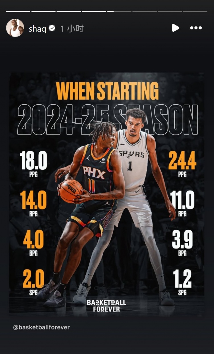 奧尼爾轉(zhuǎn)發(fā):本賽季首發(fā)時波爾場均14板4帽2斷 均高于文班亞馬