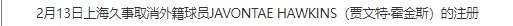 2月14日訊 今天,CBA官方更新了外籍球員注冊(cè)信息表,上海取消了因傷賽季報(bào)銷的賈文特-霍金斯。