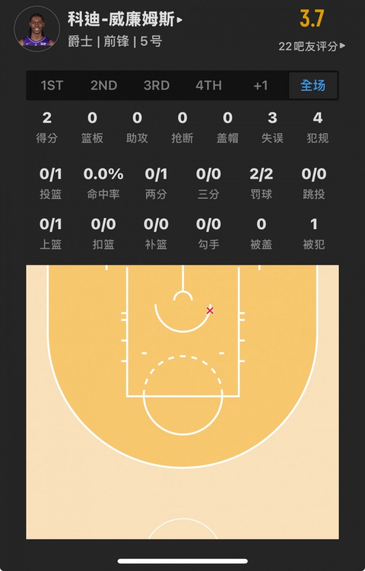 爵士10號秀 科迪-威廉姆斯 登場16.1分鐘