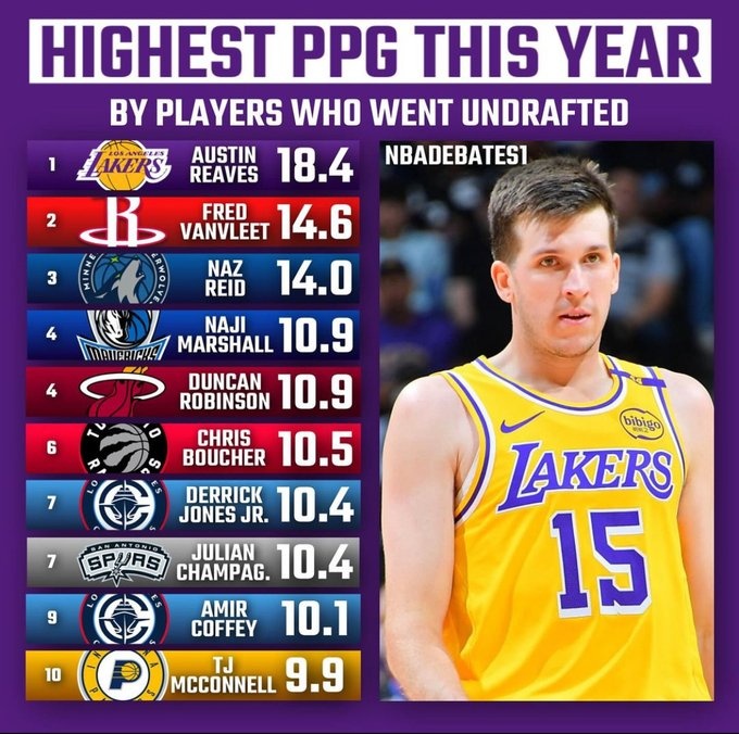 - 本賽季落選秀場均得分榜:里夫斯18.4分第1 范喬丹&里德排2、3位