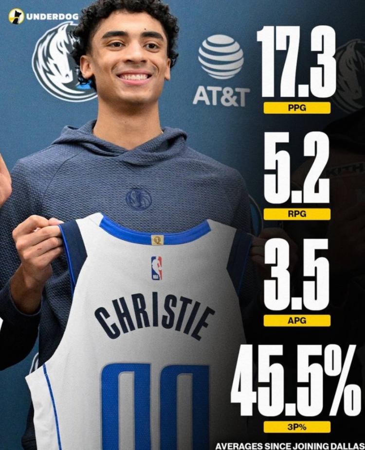 在加盟獨行俠后,克里斯蒂場均場均拿下17.3分5.2籃板3.5助攻,三分命中率45.5%。