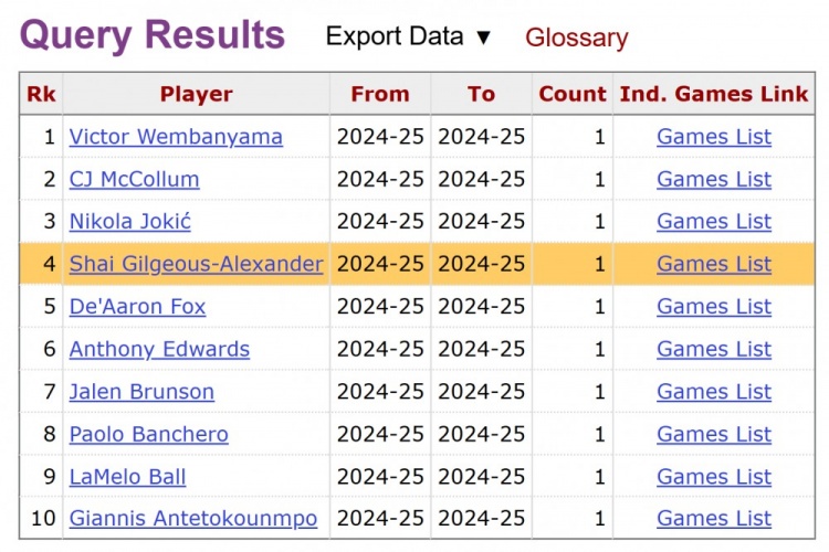 據(jù)統(tǒng)計,亞歷山大是聯(lián)盟本賽季首位多次砍下50+的球員,其他人最多1次。共9人做到過1次50+,具體如下: