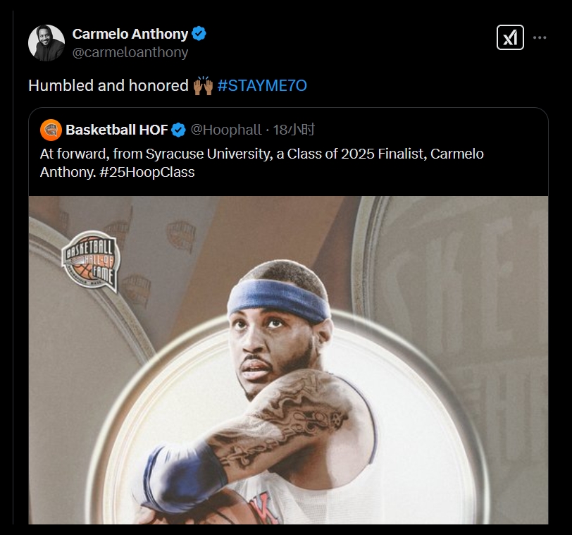 安東尼轉(zhuǎn)發(fā)自己入選2025年名人堂最終候選名單新聞:謙卑且榮幸!