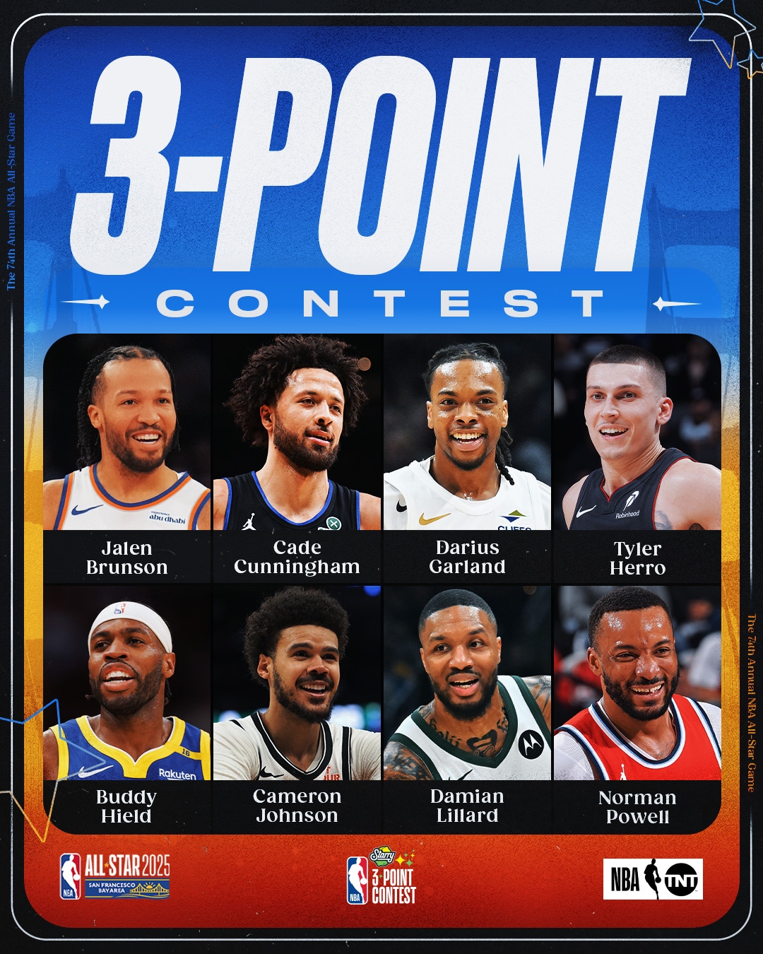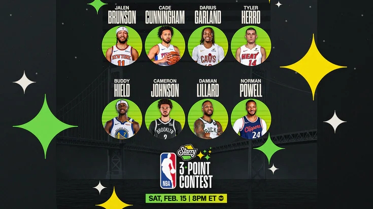 02月16日訊 NBA2025年舊金山全明星周末三分大賽在大通中心進行,參賽球員:布倫森(尼克斯)、凱德-康寧漢姆(活塞)、加蘭(騎士)、利拉德(雄鹿)、希爾德(勇士)、卡梅隆-約翰遜(籃網(wǎng))、希羅(熱火)和諾曼-鮑威爾(快船)!
