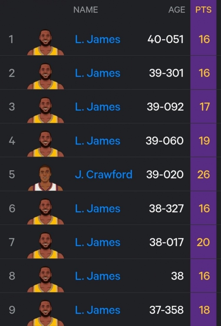 至此,40歲51天的詹姆斯再次刷新了自己保持的歷史最老末節(jié)得分16+紀(jì)錄,此前創(chuàng)紀(jì)錄時(shí)詹姆斯39歲301天。
