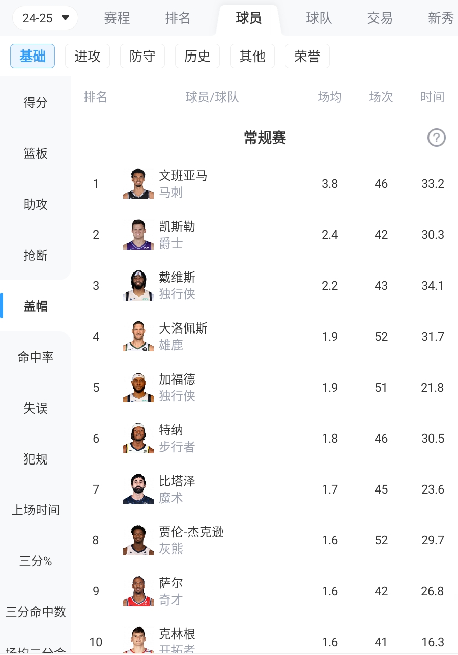 本賽季,文班亞馬代表馬刺出戰(zhàn)46場(chǎng)常規(guī)賽,場(chǎng)均貢獻(xiàn)24.3分11籃板3.7助攻1.1搶斷3.8蓋帽。在蓋帽一項(xiàng)數(shù)據(jù)當(dāng)中,文班斷檔領(lǐng)先第二名的爵士球員凱斯勒。