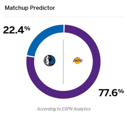 ESPN預(yù)測了本場比賽勝率,其中主場作戰(zhàn)的湖人勝率高達(dá)77.6%,獨行俠為22.4%。