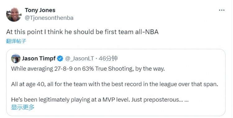 比賽結(jié)束后,TA記者Tony Jones在社媒上談到了詹姆斯,他先是轉(zhuǎn)發(fā)了一位媒體人的評(píng)論,在旁邊寫道:“目前我認(rèn)為他應(yīng)該是一陣成員?!?/p>