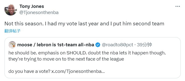 之后,被網(wǎng)友問到有沒有投票權(quán)時(shí),Tony Jones回復(fù):“不是這個(gè)賽季。上賽季我有投票權(quán),我把他列在二陣?yán)锩?。?/p>