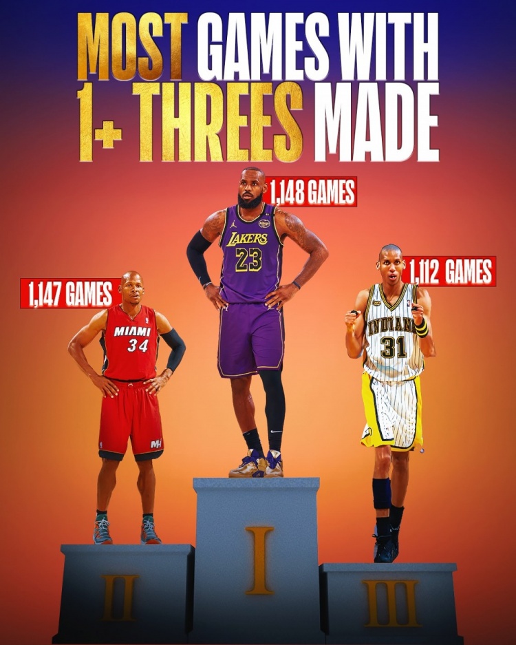 據(jù)統(tǒng)計(jì),本場比賽過后,詹姆斯生涯至今已經(jīng)有1148場比賽至少命中1記三分,超越雷-阿倫(1147)獨(dú)霸歷史第一,雷吉-米勒(1112場)排名歷史第三。