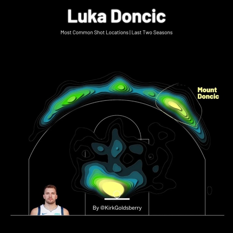當(dāng)你繪制出東契奇最常見的投籃位置時,有兩個熱點(diǎn):一個在籃筐附近,另一個是在三分線外左側(cè)45度處。這個外線熱點(diǎn)正是東契奇在周日的比賽中讓布勞恩上當(dāng)?shù)牡胤健@也是東契奇最喜歡的起舞的位置。