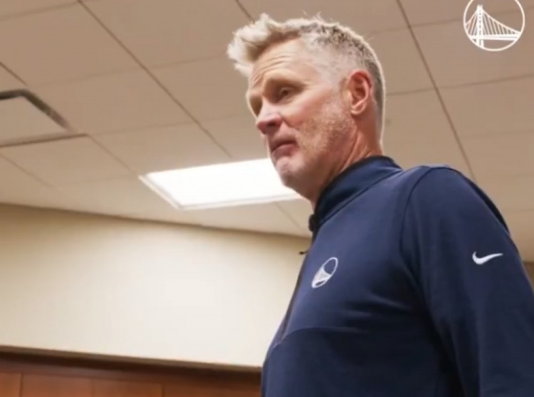 2月28日訊 勇士今日在客場17分大逆轉(zhuǎn)、121-115戰(zhàn)勝魔術(shù)。賽后科爾在更衣室內(nèi)表揚(yáng)球員。