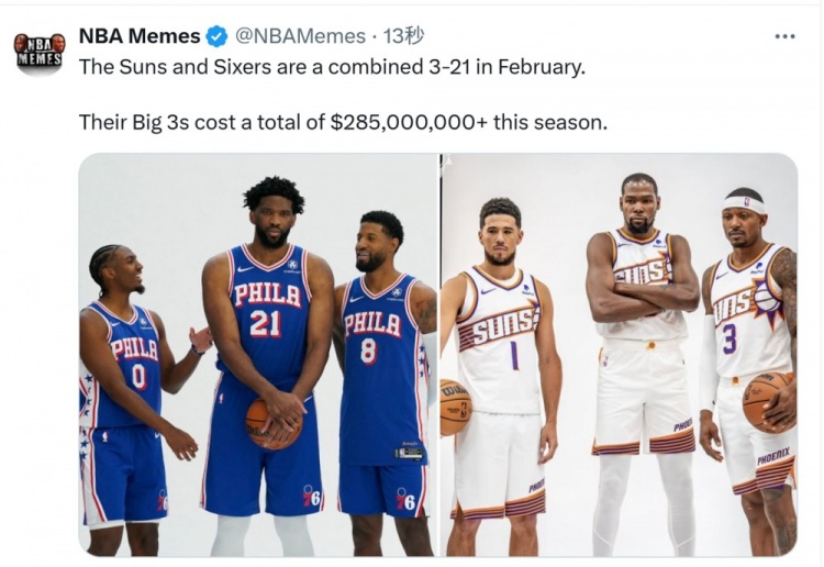 難兄難弟!美媒:太陽&76人2月共3勝21負 兩邊三巨頭工資2.85億+