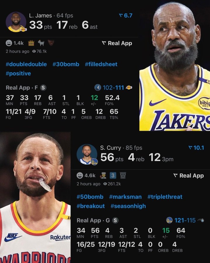 庫(kù)里和詹姆斯都在各自參加的比賽中打出了精彩的表現(xiàn),庫(kù)里25中16(三分19中12)、罰球12中12,瘋狂砍下56分4板3助2斷!老詹21投11中,三分9中4,罰球10中7,得到33分17籃板6助攻1搶斷1蓋帽。
