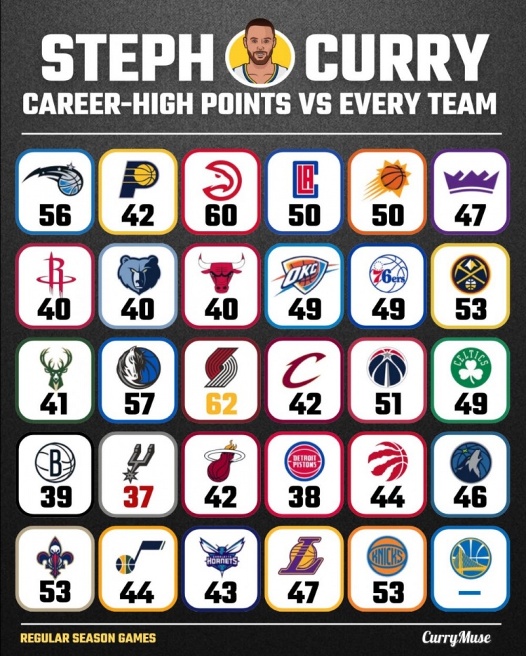 庫(kù)里對(duì)陣29隊(duì)最高分:9隊(duì)被掄下50+ 開(kāi)拓者成最大受害者
