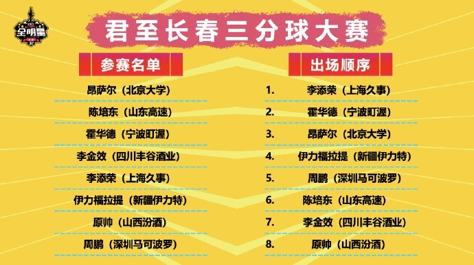 根據(jù)抽簽結(jié)果,技巧賽首輪偰李永煒VS徐杰,趙繼偉VS朱俊龍,原帥三分大賽壓軸出場(chǎng),迪亞洛則是扣籃大賽最后一個(gè)出場(chǎng)。