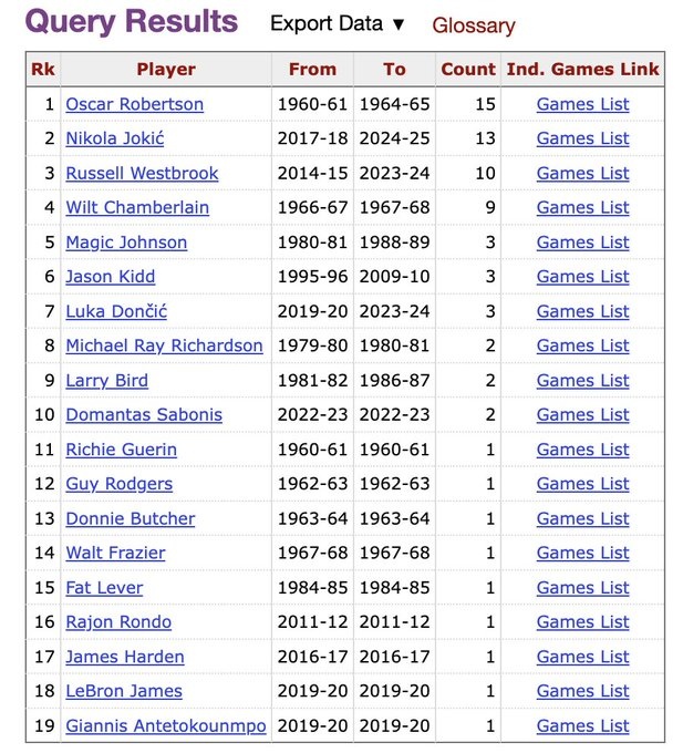 據(jù)統(tǒng)計(jì),這是約基奇生涯第14場比賽至少15分15板15助攻,歷史第2多,距離歷史紀(jì)錄保持者大O僅差1次。