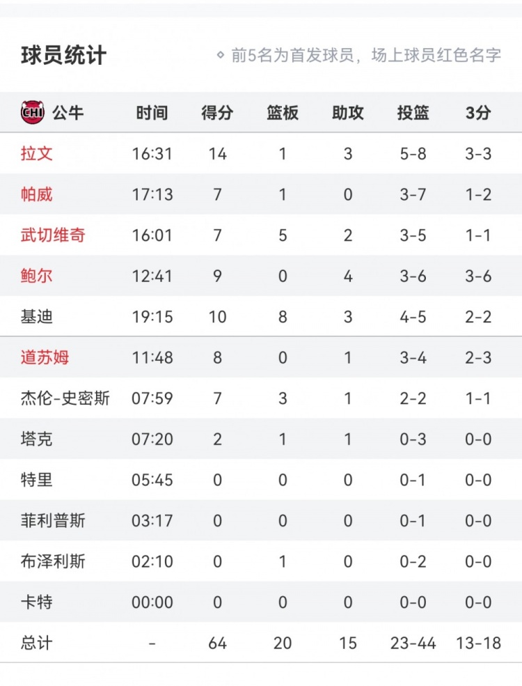 上半場,公牛外線神準(zhǔn),全隊(duì)三分18投13中,命中率高達(dá)72.2%,其中拉文三分3投3中。