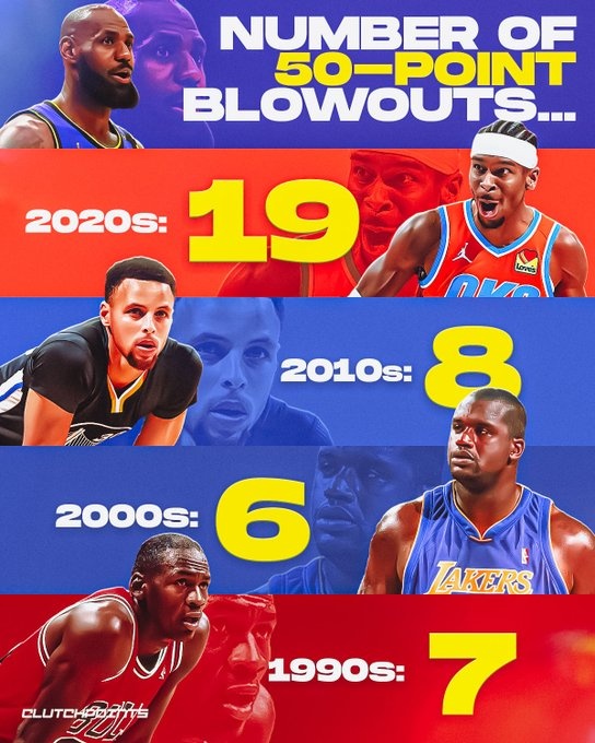 - 常規(guī)賽分差50+場次:2020年至今19次 20年之前30年21次