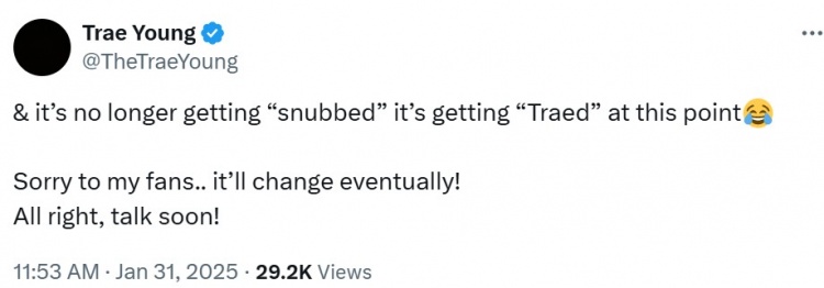 特雷-楊無緣本賽季的全明星,對此,他更推道:“這不是被‘冷落’了,而是被‘特雷-楊’啦。對不住我的球迷們。這遲早會改變的!就這樣,回頭再聊?!?/p>