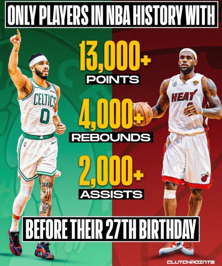 - 塔圖姆27歲前至少13000分4000板2000助 歷史唯二&比肩詹姆斯