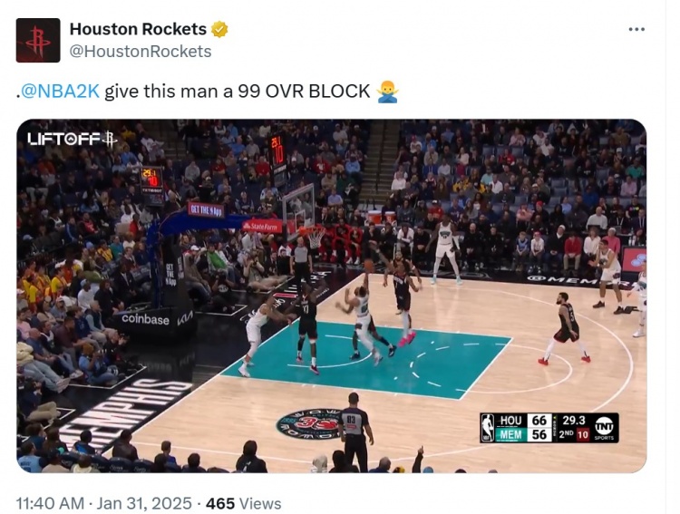 火箭官推轉(zhuǎn)發(fā)了這個(gè)蓋帽,并@NBA 2K官方道:“給這個(gè)小伙子99分的蓋帽值吧。”