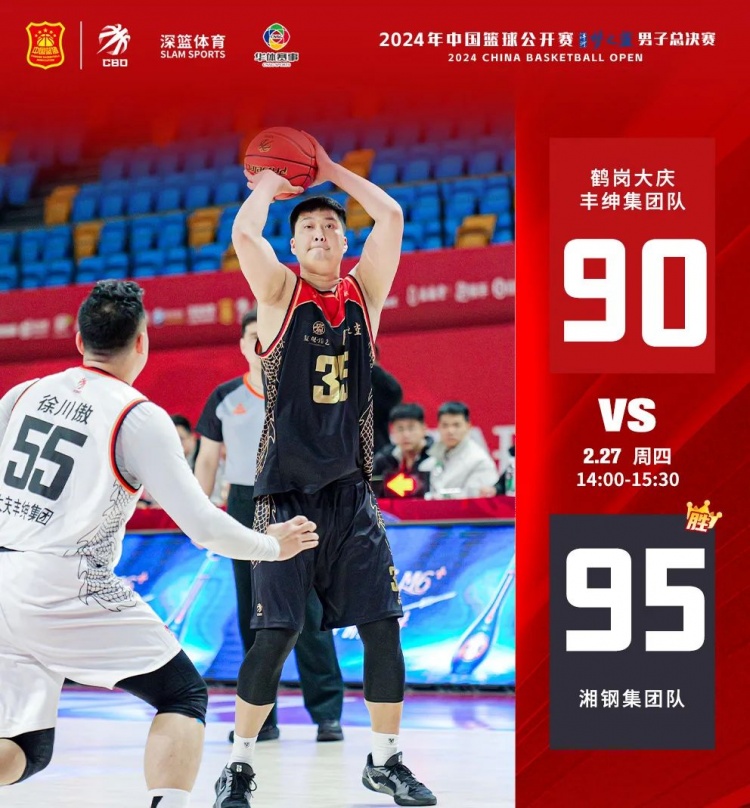 比賽開始,兩隊(duì)上來比較慢熱。隨后大慶豐紳集團(tuán)積極拼搶前后場籃板,牢牢把握籃下優(yōu)勢,率先取得領(lǐng)先。湘鋼集團(tuán)組織快攻,同時在外線穩(wěn)定輸出,緊咬比分。半場結(jié)束,大慶豐紳集團(tuán)48-46領(lǐng)先湘鋼集團(tuán)。下半場,兩隊(duì)打得依舊膠著。末節(jié)90平后,湘鋼集團(tuán)26號陳雙三分命中,2號達(dá)斯坦·哈爾恒搶斷后上籃得分,幫助湘鋼集團(tuán)95-90戰(zhàn)勝大慶豐紳集團(tuán)。