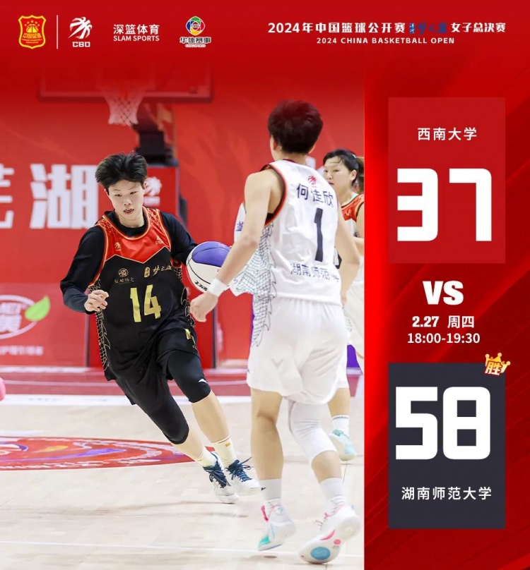 上半場,在開局短暫僵持后,湖南師范大學開始進攻,15號劉嘉芳后場籃板拼搶積極,6號沈思榆、1號何佳欣兩分命中,湖南師范大學22-8領先西南大學。次節(jié)湖南師范大學繼續(xù)高歌猛進,多次搶斷快攻打成。半場結(jié)束,湖南師范大學36-20領先。下半場,西南大學手感欠佳,兩節(jié)只得到17分,最終湖南師范大學58-37戰(zhàn)勝西南大學。