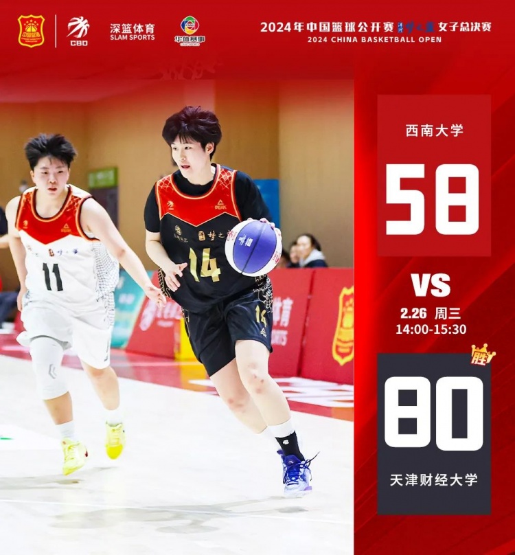上半場首節(jié),兩隊打得相對膠著,比分緊咬。第二節(jié),西南大學(xué)手感欠佳,單節(jié)只得到9分。天津財經(jīng)大學(xué)則保持著不錯的進(jìn)攻勢頭,單節(jié)拿到25分。半場結(jié)束,天津財經(jīng)大學(xué)37-24領(lǐng)先西南大學(xué)。下半場,西南大學(xué)7號應(yīng)茵、12號莫琇雅前后場籃板拼搶積極,但無奈前期存在一定差距,最終西南大學(xué)58-80不敵天津財經(jīng)大學(xué)。