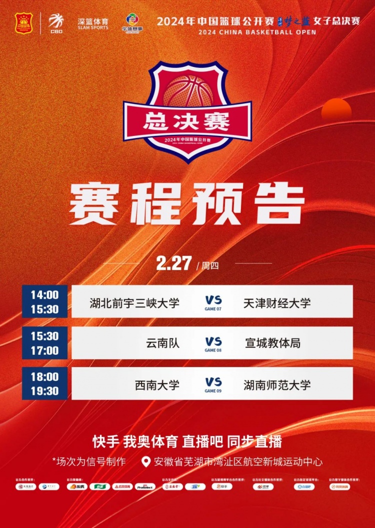 2月26日,2024年中國籃球公開賽洋河夢之藍(lán)女子總決賽繼續(xù)在安徽省蕪湖市灣沚區(qū)航空新城運動中心進(jìn)行。在第二輪結(jié)束的三場比賽中,天津財經(jīng)大學(xué)、湖北前宇三峽大學(xué)收獲首場勝利,云南隊力克湖南師范大學(xué)取得兩連勝。