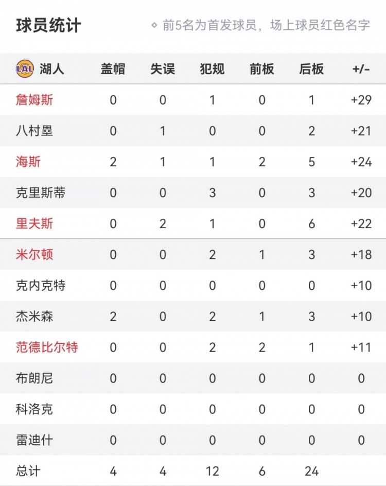 半場比賽,湖人每名出場球員正負值都很高,均達到了兩位數。