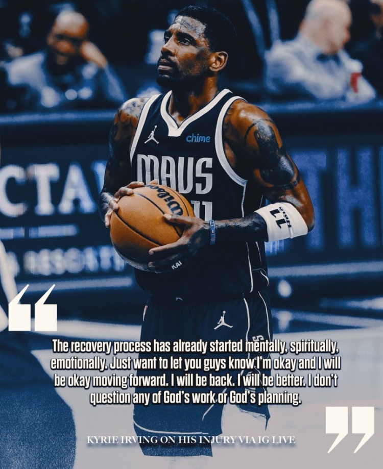 歐文在社交媒體上直播時說道:“我在心理上、情感上和精神上的恢復(fù)過程已經(jīng)開始了。我想讓大家知道,我很好,我之后會好起來的。我會回來的。我會變得更好。我不會去質(zhì)疑上帝的工作或者是計劃?!?/p>