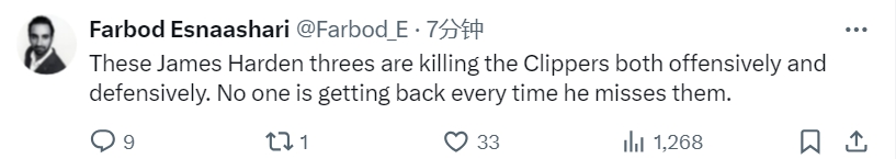 船記:哈登的三分在傷害快船 投不進時沒人能退回來
