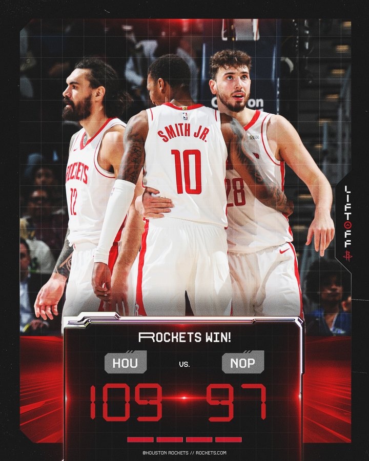 賽后,火箭官方曬出本場贏球海報,申京、亞當(dāng)斯和小賈巴里登上封面。