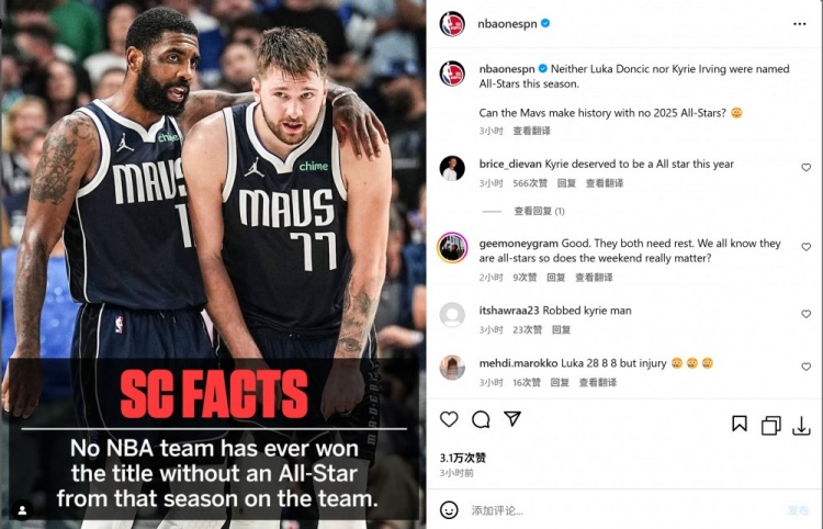 美媒NBAonESPN:“歐文和獨行俠本賽季都沒有入選全明星,獨行俠能創(chuàng)造歷史嗎?”