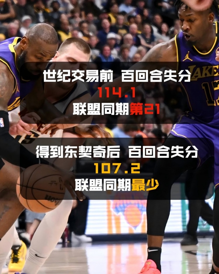 而比起進(jìn)攻端如虎添翼,令人驚訝的是,他們?cè)诜朗囟烁谴虺隽饲八从械馁|(zhì)量。在一個(gè)被質(zhì)疑“防守有巨大問(wèn)題”的東契奇加入之后,湖人隊(duì)反而成為百回合失分同期最少的球隊(duì)。他們每百回合足足少丟了6.9分,成為交易日后聯(lián)盟獨(dú)一檔的防守鐵軍。