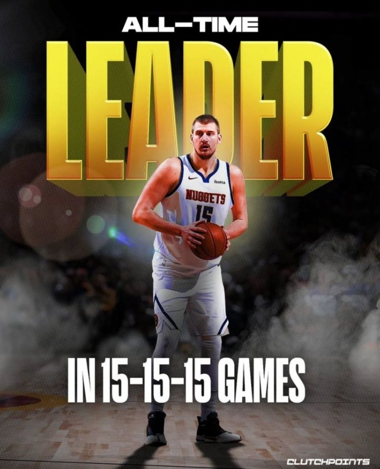 約基奇生涯已經(jīng)15次單場(chǎng)至少15分15板15助 追平大O&并列歷史第一