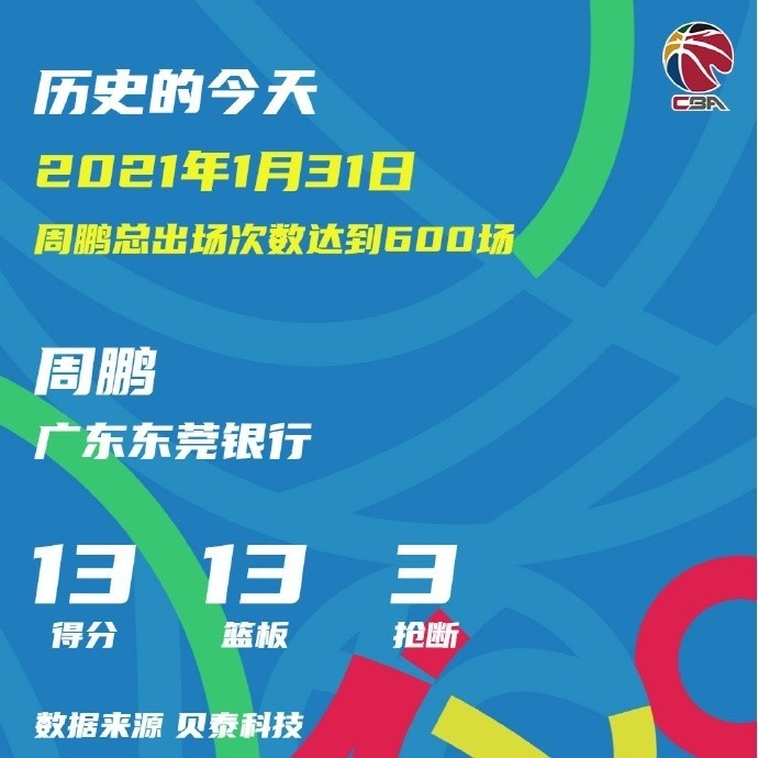 2021年1月31日,CBA聯(lián)賽常規(guī)賽第37輪,廣東東莞大益以120-98戰(zhàn)勝蘇州肯帝亞。這場比賽,周鵬首發(fā)出戰(zhàn),全場7投4中,得到13分13籃板3搶斷。此役之后,他的總出場次數(shù)達到600場里程碑,他也是CBA聯(lián)賽歷史上第六位達到該成就的球員。彼時,他的年齡為31歲113天。