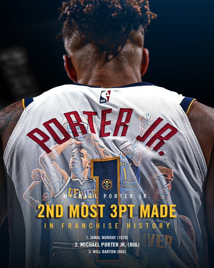 算上本場的3記三分,小波特掘金生涯三分命中數(shù)來到806記,超越巴頓,升至隊史三分榜第2位,僅次于穆雷(1079)。