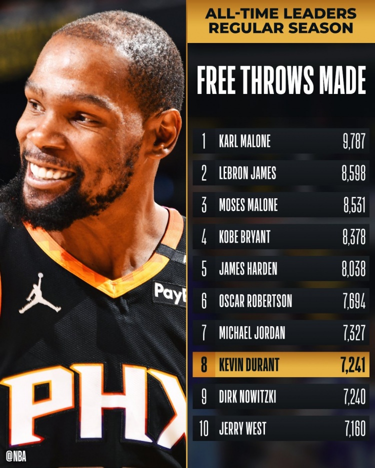 這樣一來(lái),杜蘭特生涯常規(guī)賽罰球命中數(shù)達(dá)到7241次,超越諾維茨基(7240)升至NBA歷史第8位,下一步將追逐喬丹。
