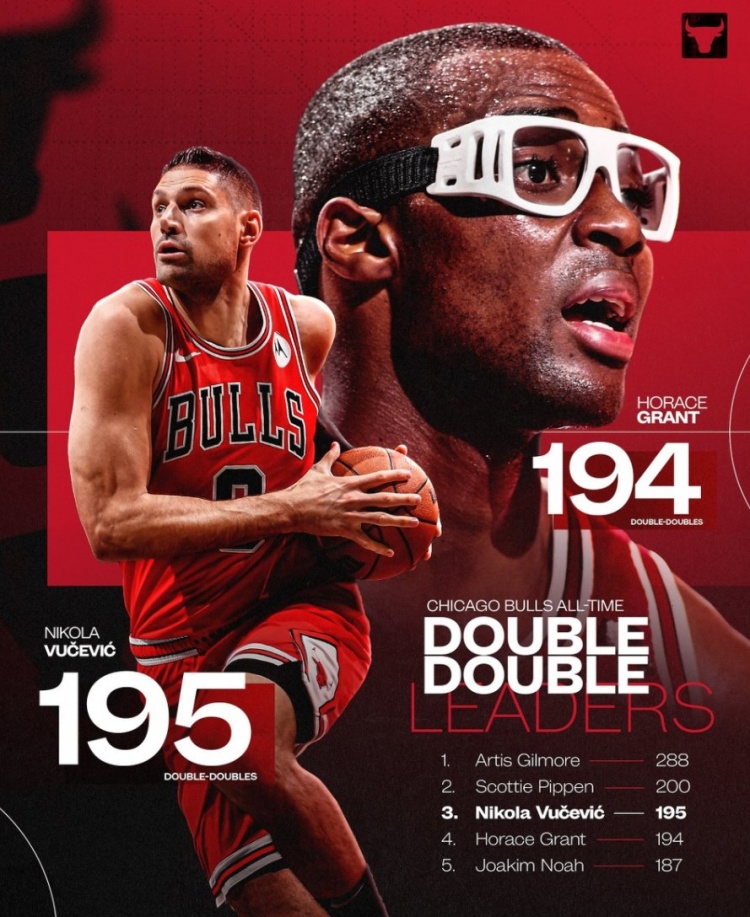 目前,武切維奇已經(jīng)得到了11分11籃板的兩雙數(shù)據(jù),他在公牛生涯的兩雙數(shù)來(lái)到195次,超越霍勒斯-格蘭特,上升至隊(duì)史第三位,僅次于皮蓬和阿蒂斯-吉爾摩爾。