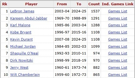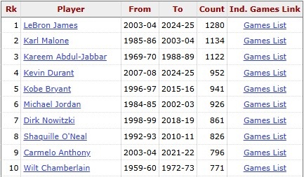 這是杜蘭特常規(guī)賽生涯第953場單場20+,同樣排在歷史第四,僅次于詹姆斯(1280)、卡爾-馬龍(1134)和賈巴爾(1122)。