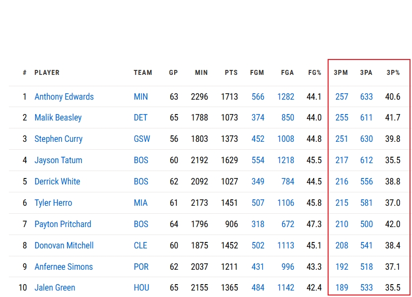 03月11日訊 今日比賽結(jié)束后,聯(lián)盟三分榜最新情況如下。