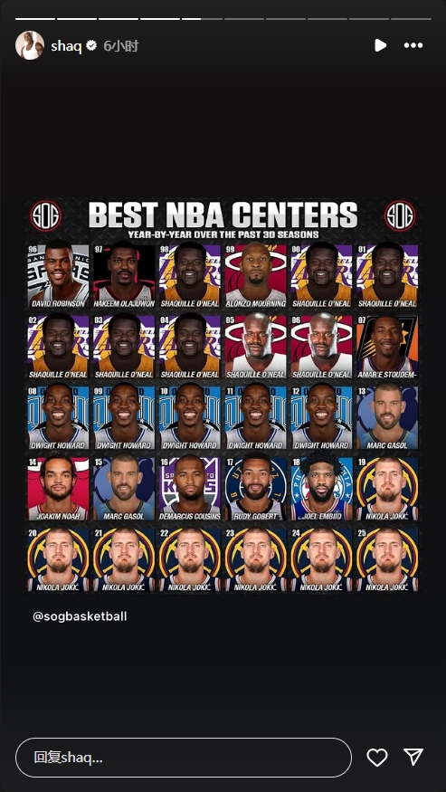 奧尼爾曬過(guò)去30年最佳中鋒:自己9年8度上榜 約基奇統(tǒng)治最近7年