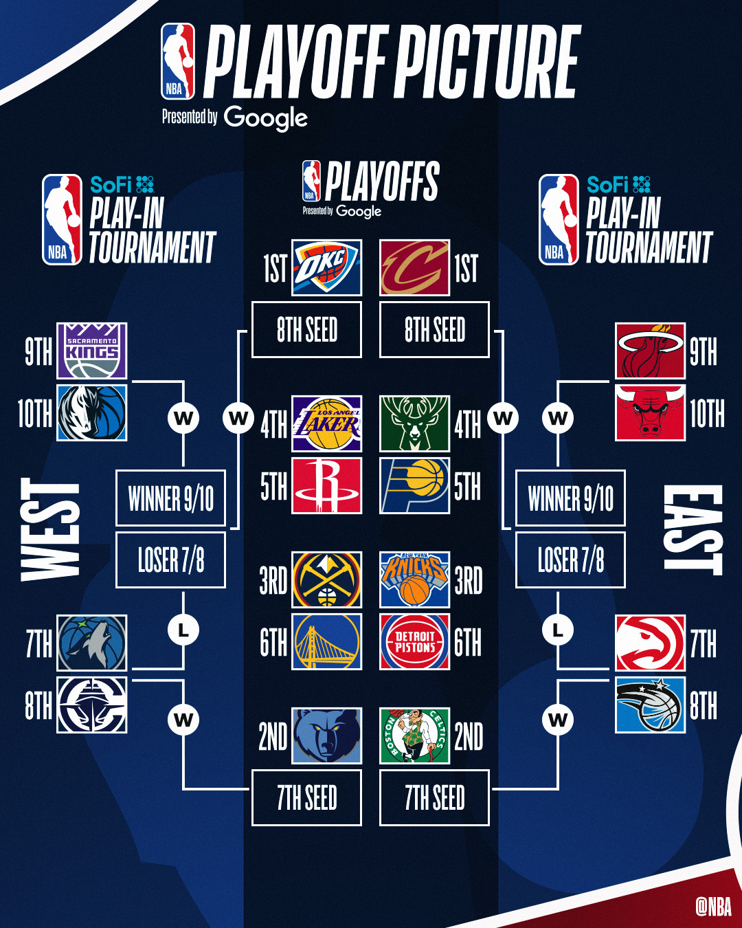 西部方面,湖人vs火箭;掘金vs勇士;附加賽區(qū)國王、獨(dú)行俠、森林狼、快船爭奪最后的兩個季后賽席位,勝者(第8)vs雷霆,負(fù)者(第7)vs灰熊。