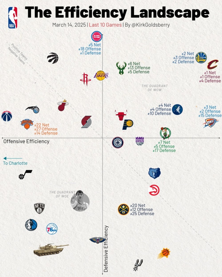 近10場(chǎng)攻防效率:騎士與活塞分別領(lǐng)銜攻防 勇士攻防均排名前三
