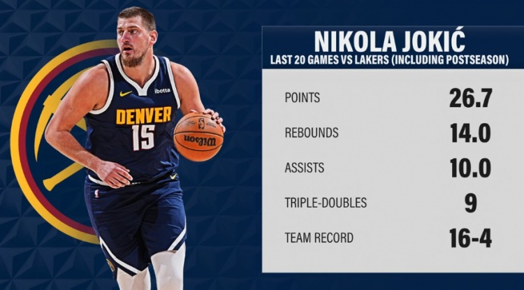 約基奇過(guò)去20場(chǎng)對(duì)陣湖人:場(chǎng)均26.7分14板10助&9次三雙 16勝4負(fù)
