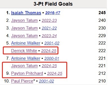 塔圖姆226球、德里克-懷特225球、普理查德215球。按照本賽季三人的場均命中數(shù),結合綠軍剩余的場次數(shù)(15場),預計3人在本賽季結束時的三分進球數(shù)為: