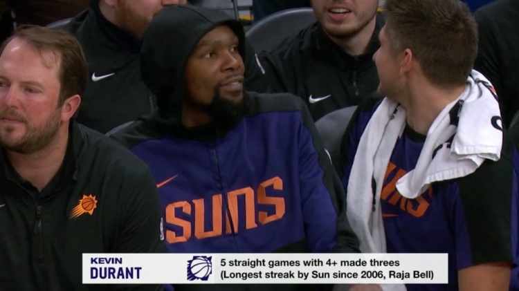 轉(zhuǎn)播方曬出數(shù)據(jù),這是杜蘭特連續(xù)5場(chǎng)比賽至少投進(jìn)4記三分。這是太陽隊(duì)史自2006年的拉加-貝爾以來,最長的紀(jì)錄。
