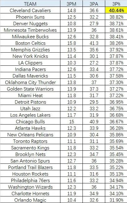本賽季,防守人距離投籃球員4英尺或以上的空位三分出手中,騎士隊的命中率高達(dá)40.4%,全聯(lián)盟斷檔第一。